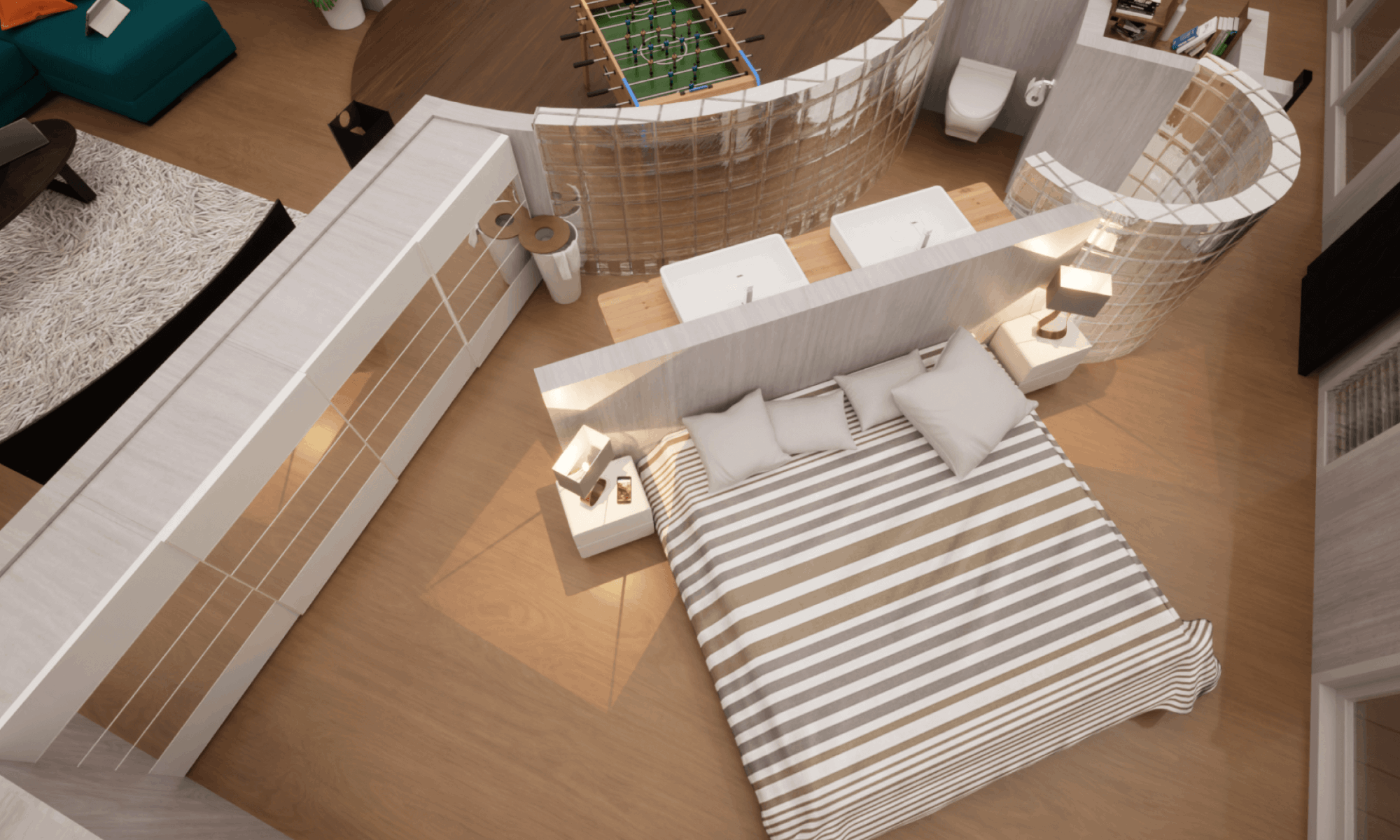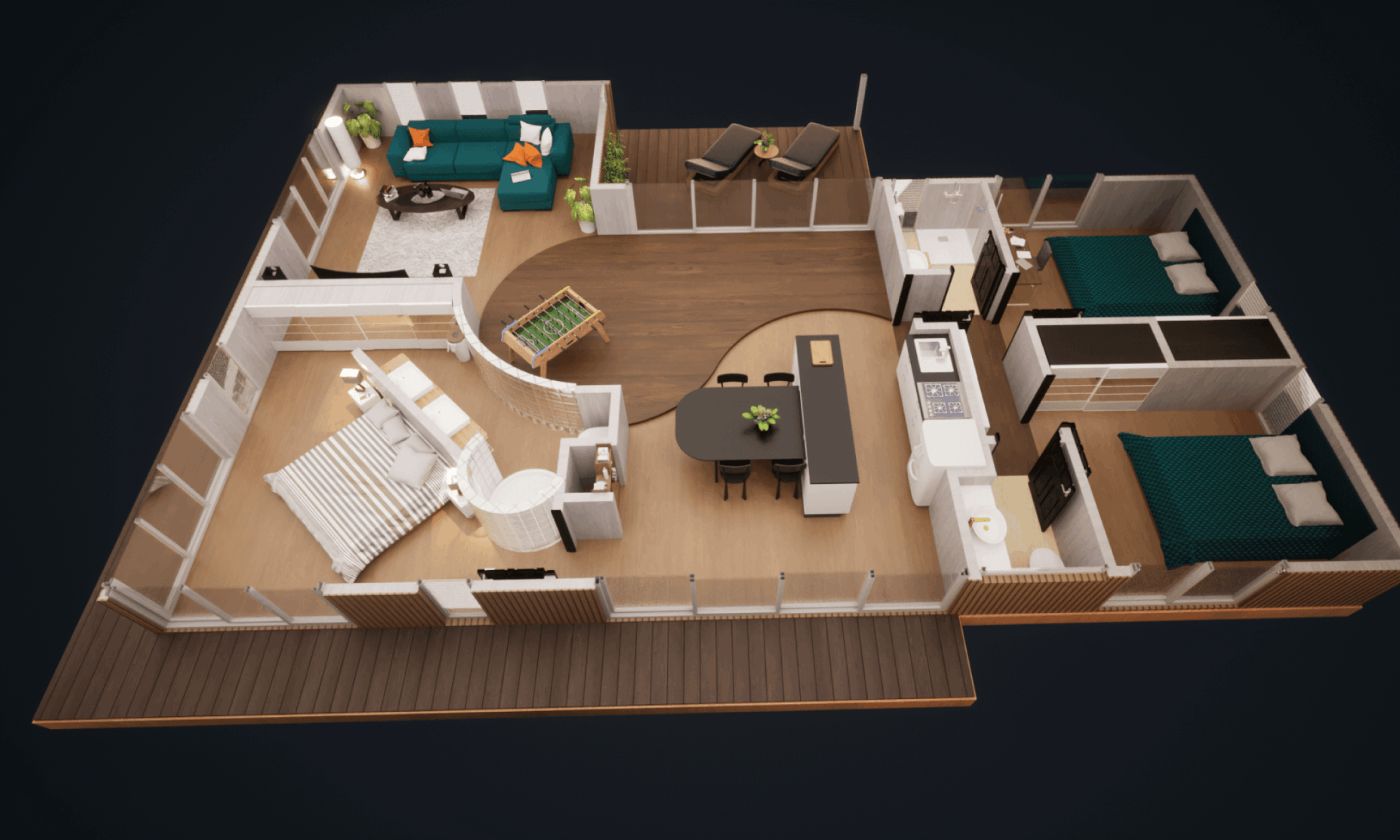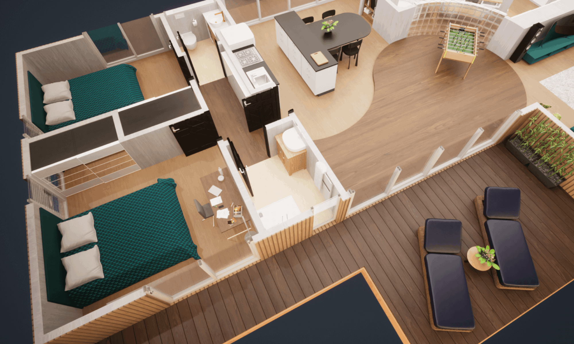 Each element (wall cladding, deck, floors, facade) can be fully customized by the client.