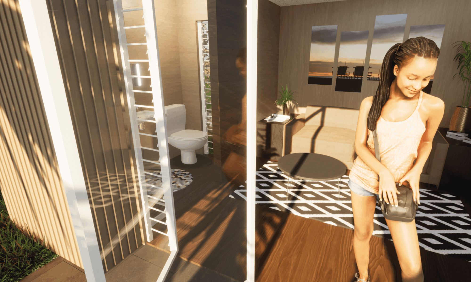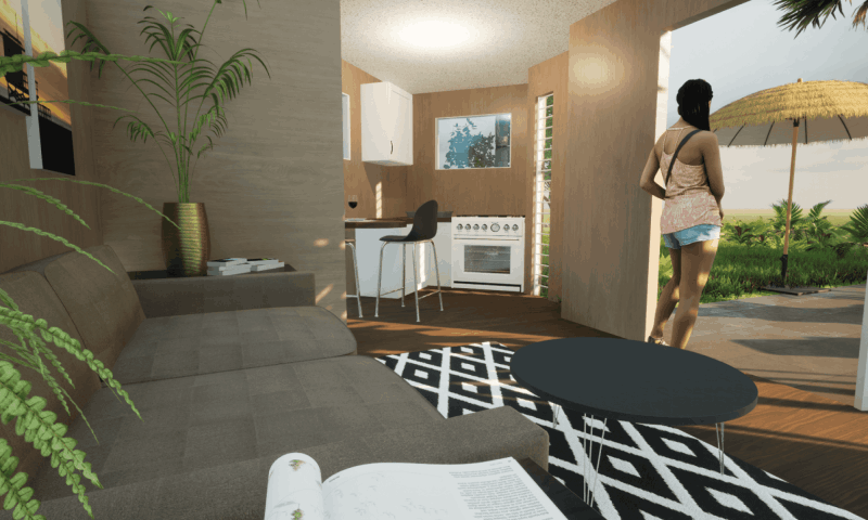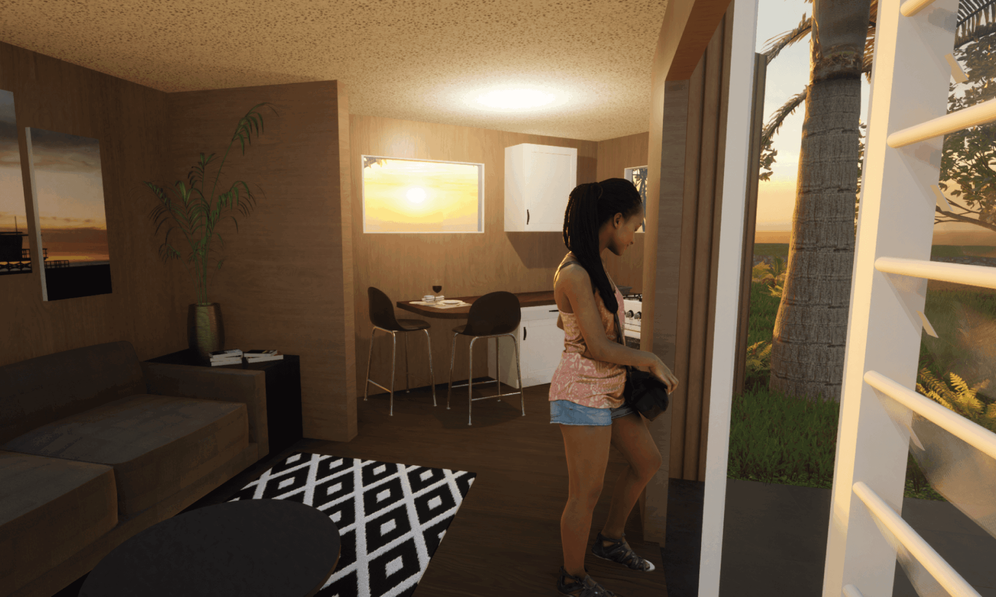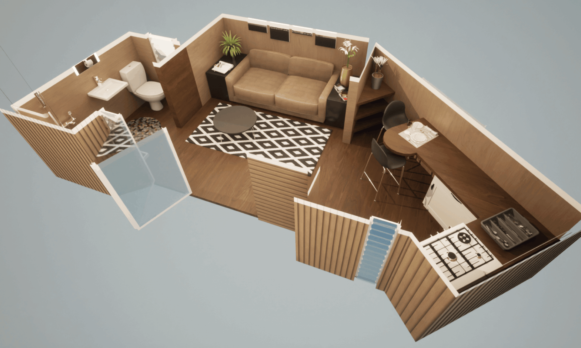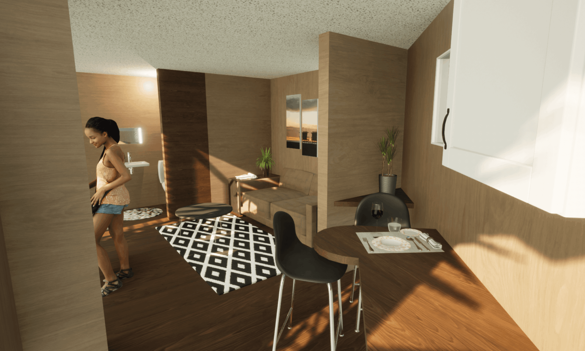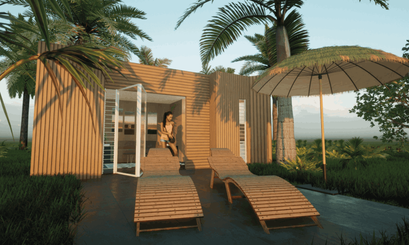 The MERI model is a small bungalow with a living room/bedroom (sofa bed), a kitchenette, and a small bathroom with a separate toilet, both separated by a sliding partition.
