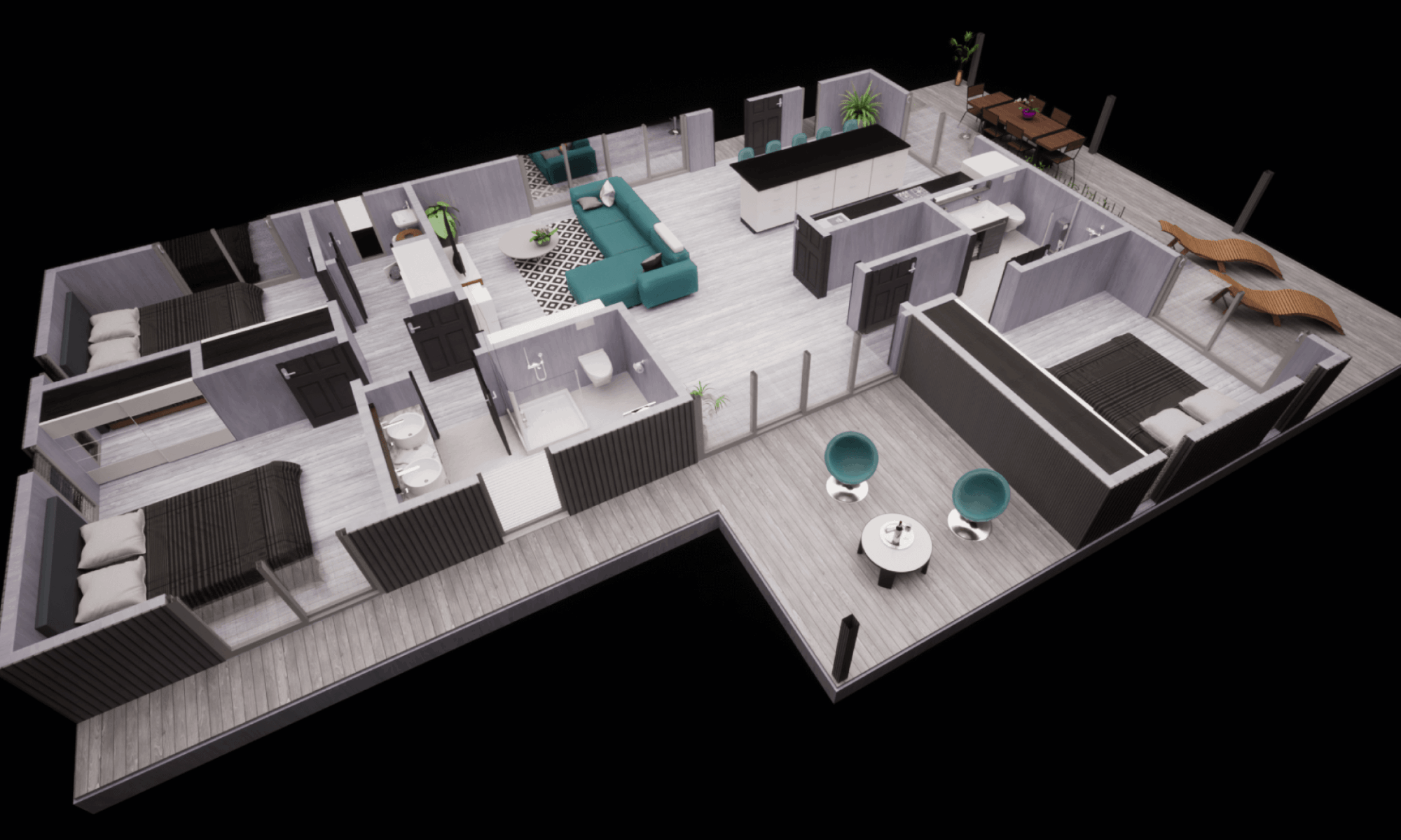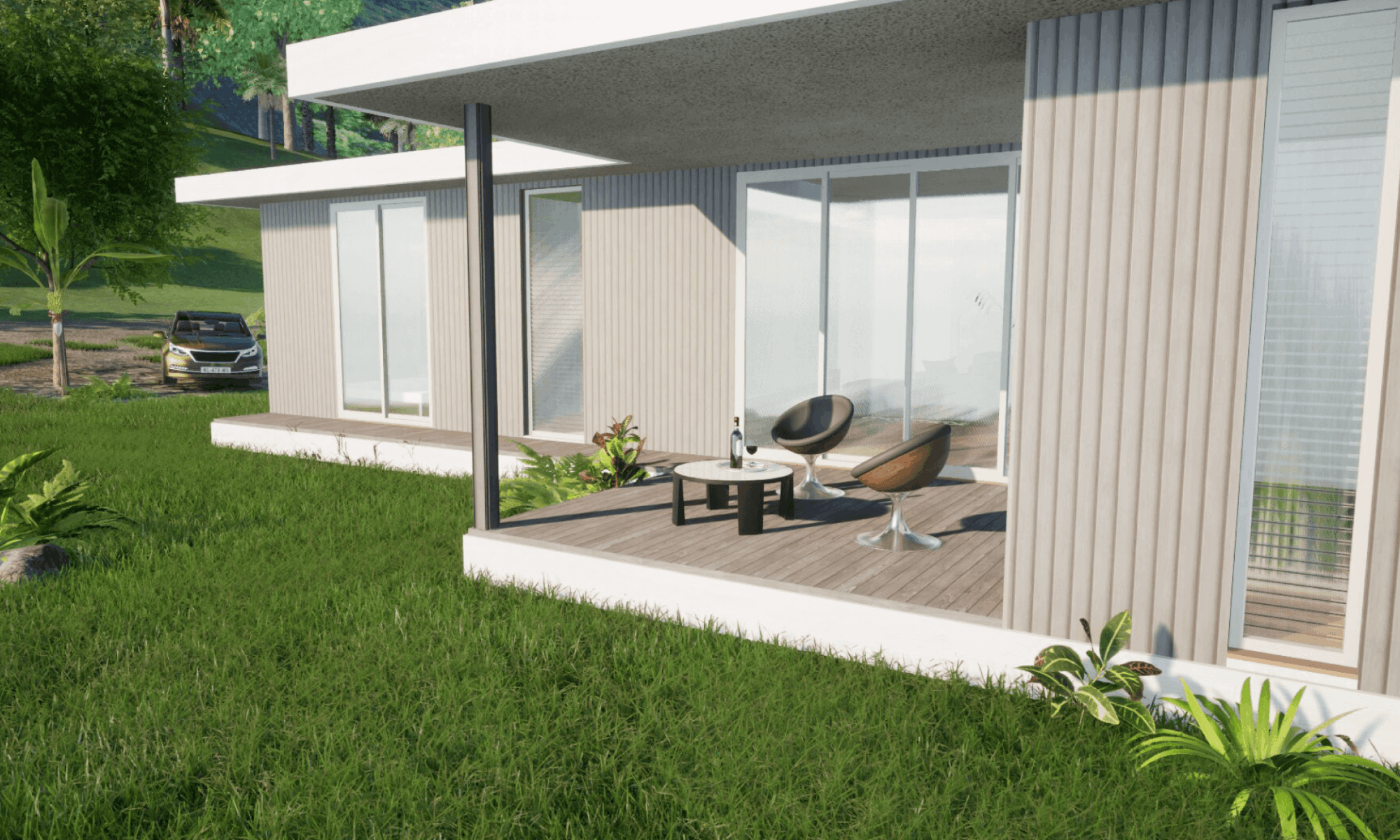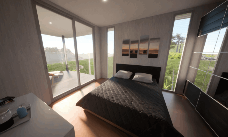 Each element (wall cladding, deck, floors, facade) can be fully customized by the client.