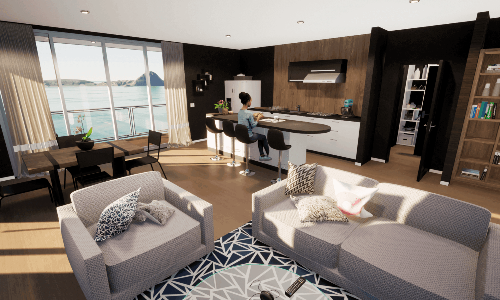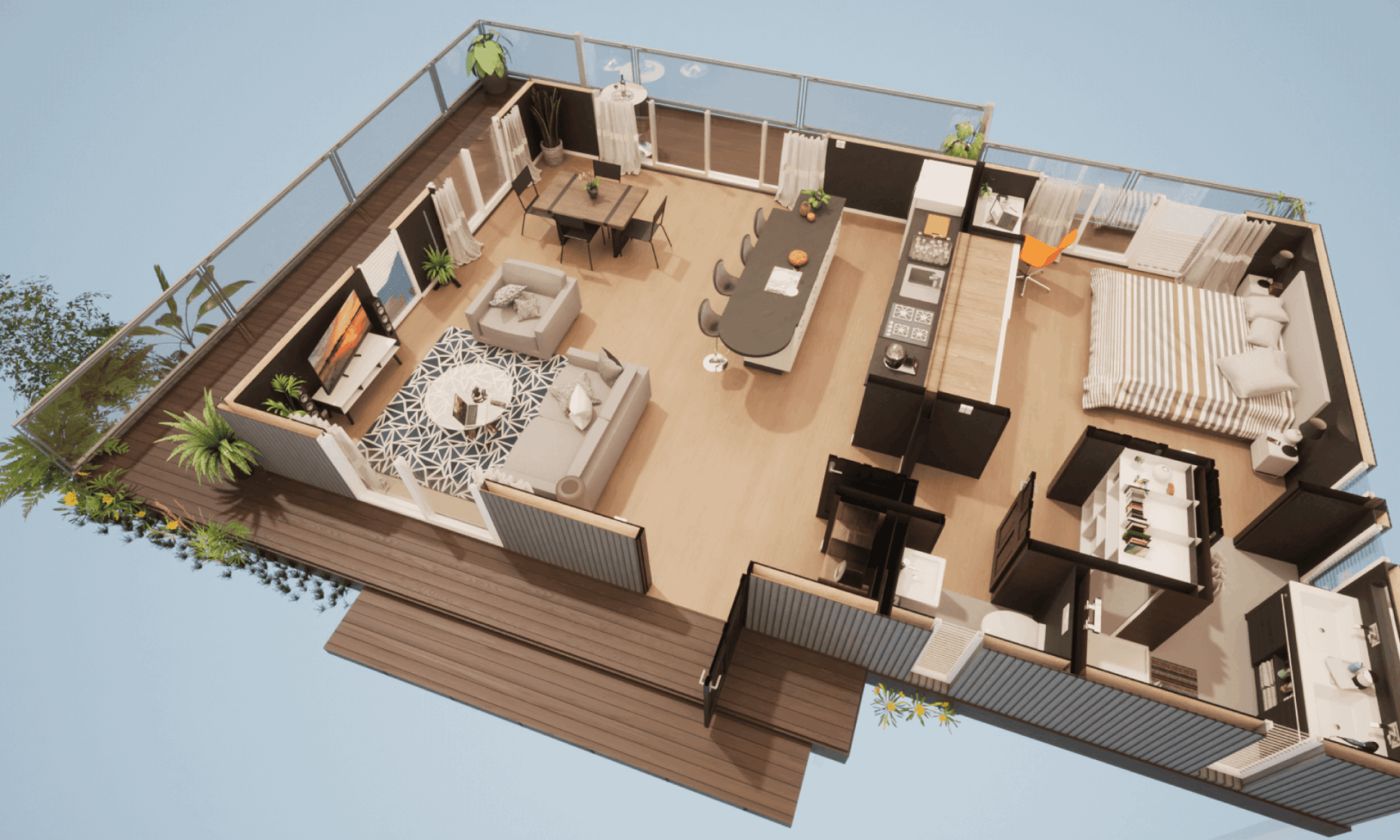 The TEIVA 1 model is a house with a living room, kitchen, dining area, a large bedroom with a dressing room, a bathroom, and a separate toilet, an entrance hall with storage, and a large terrace surrounding the accommodation.